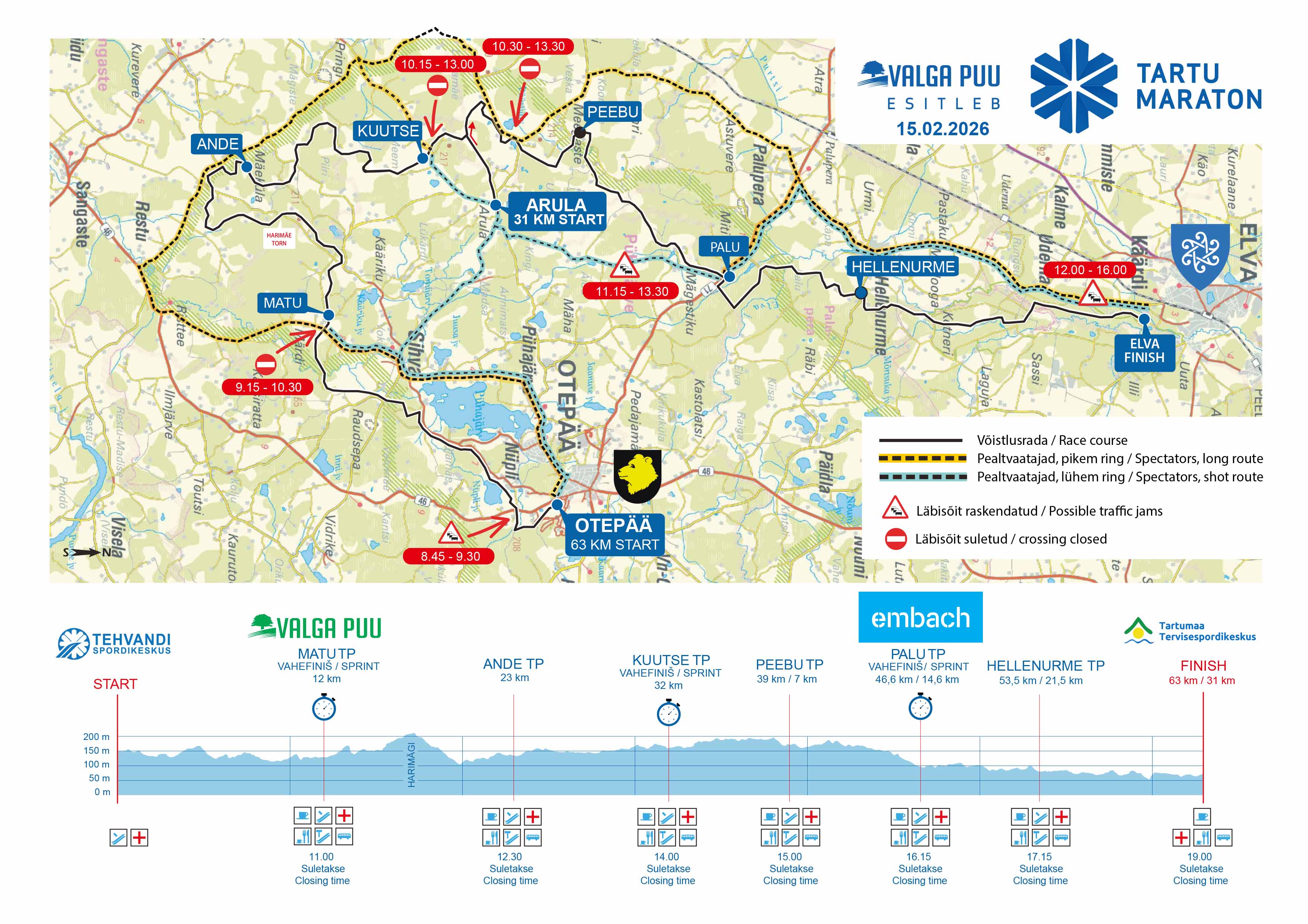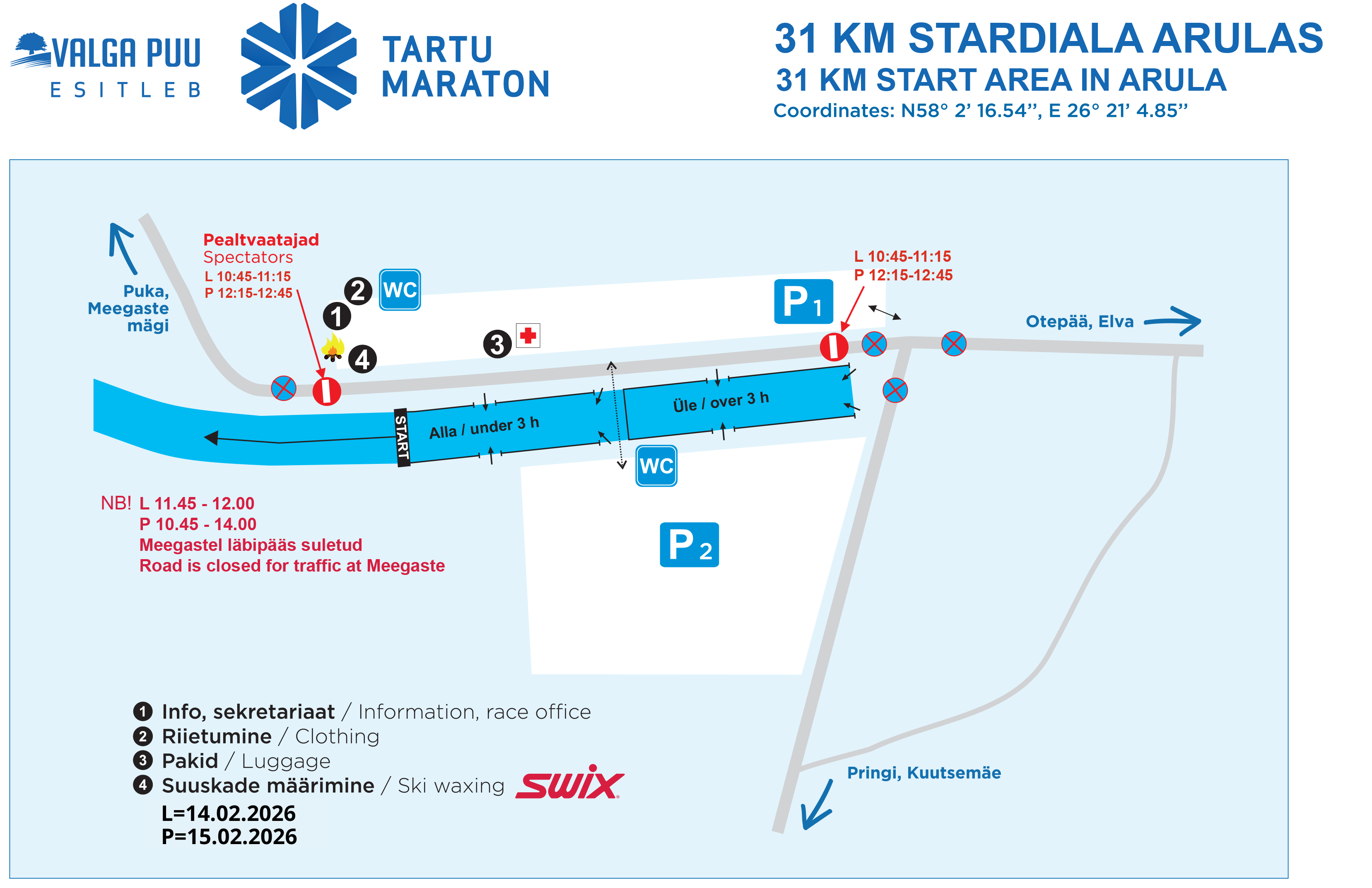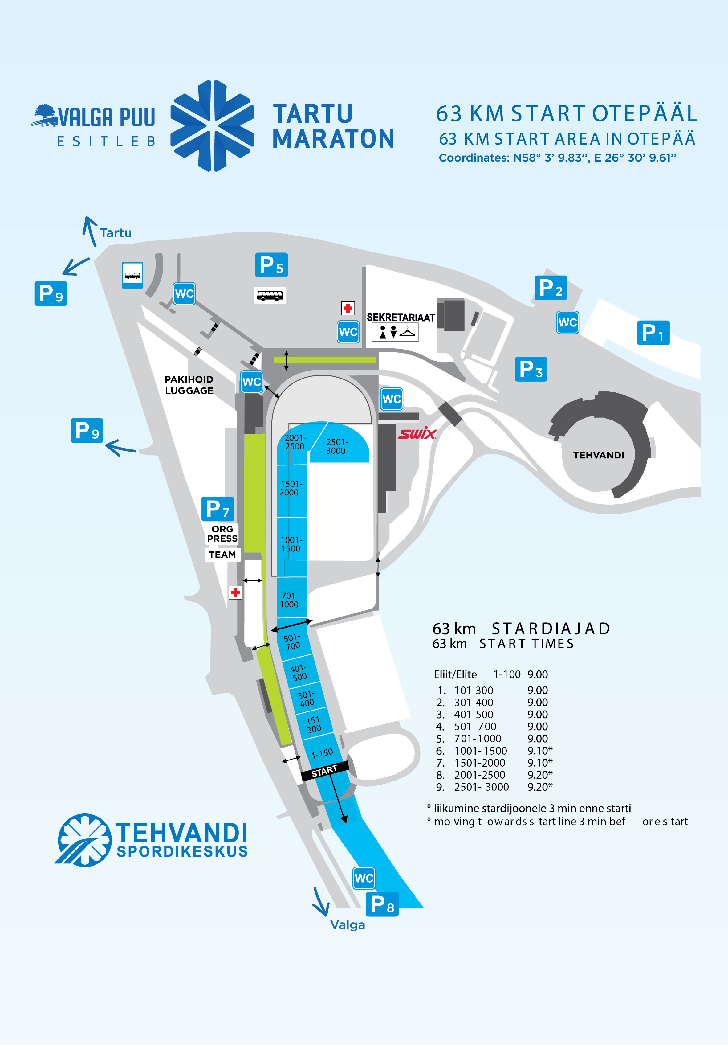 Pühapäeva hommikul asub 63 km stardinumbrite väljastus ja osalejate riietumine vastvalminud Tehvandi Tugiteenuste Keskuses, mis on avatud alates kell 7:30.