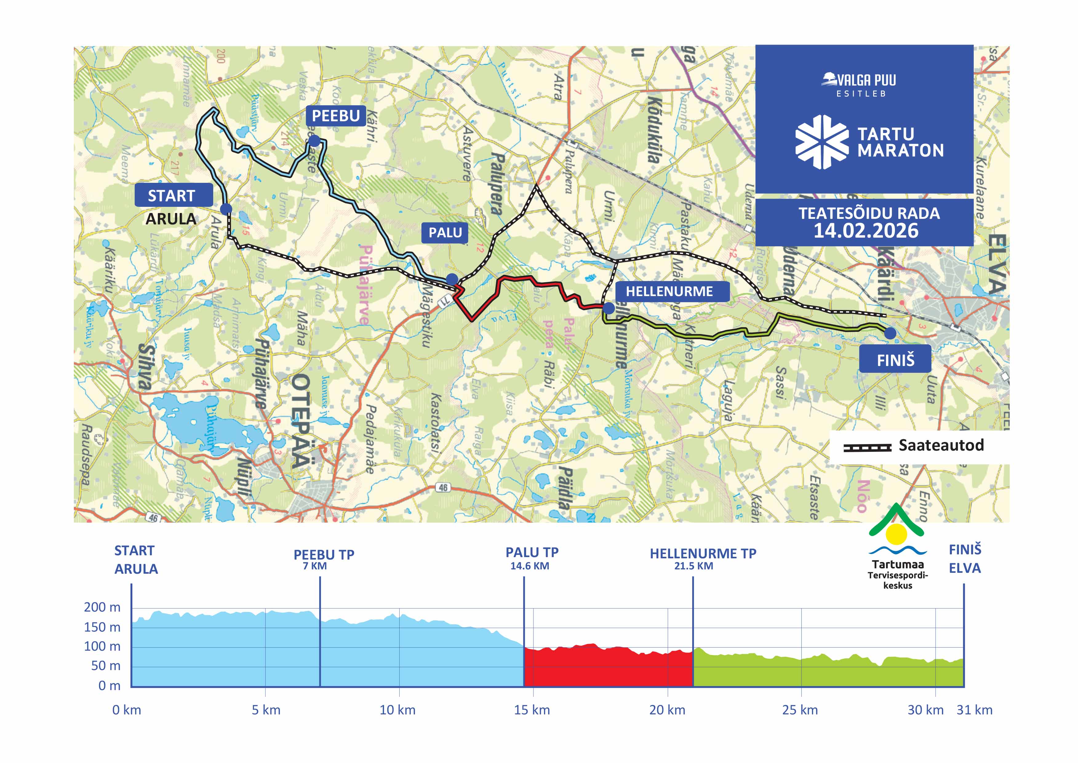 63 km rajal on kolm vahefinišit: Matu (12 km), Kuutse ( 32 km) ja Palu (46,6 km).